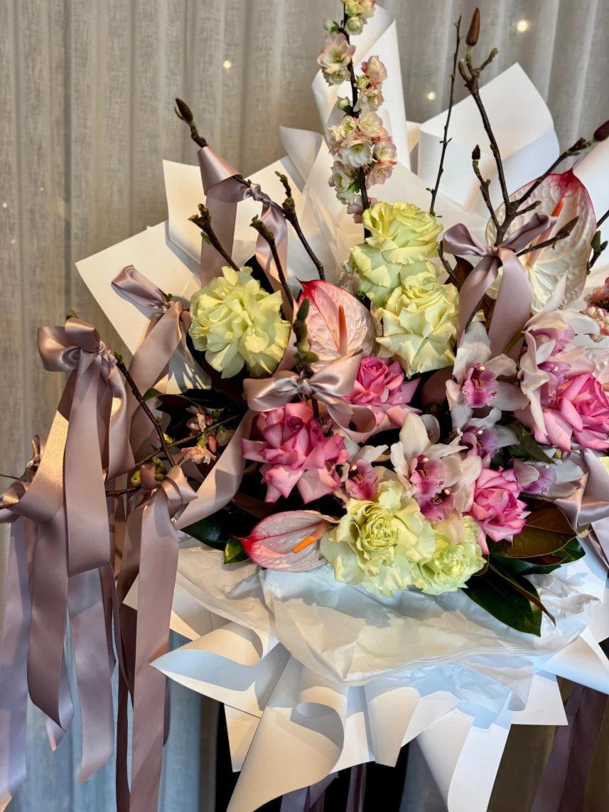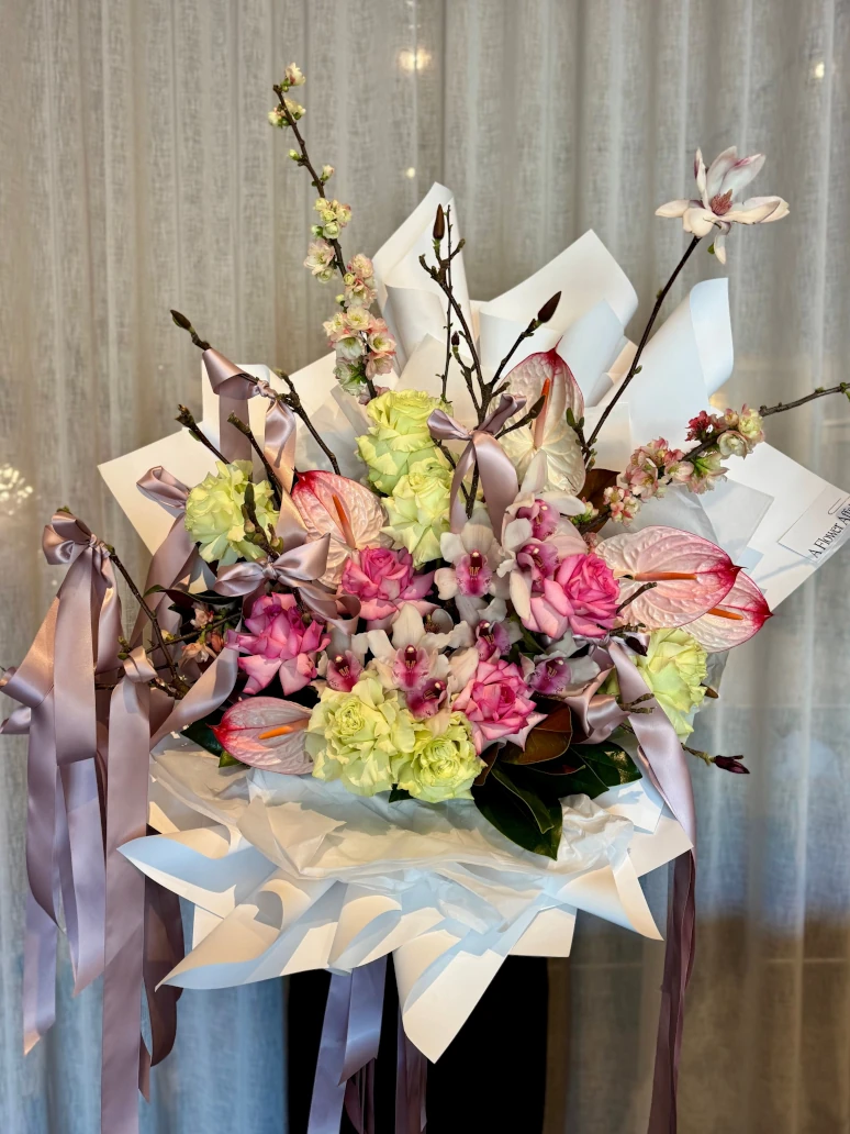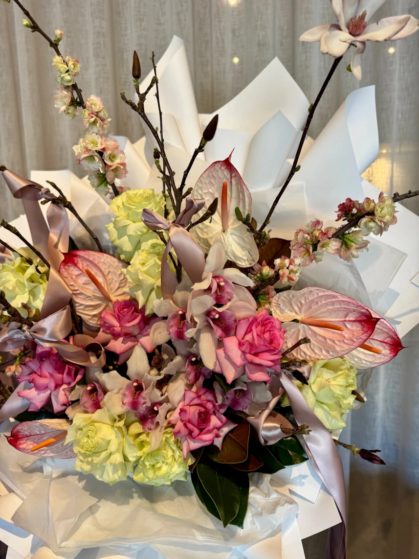 “Let me know” with roses, orchids, anthuriums and ribbons.