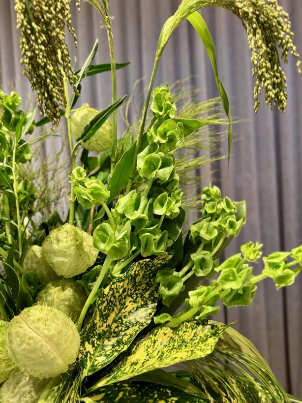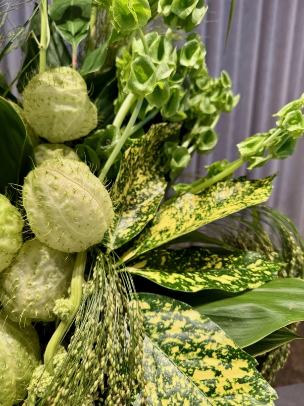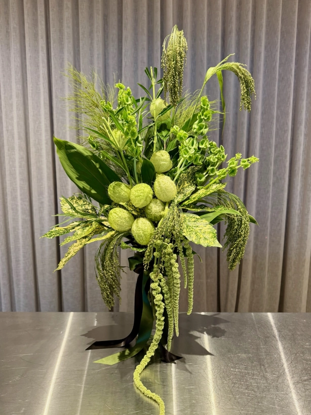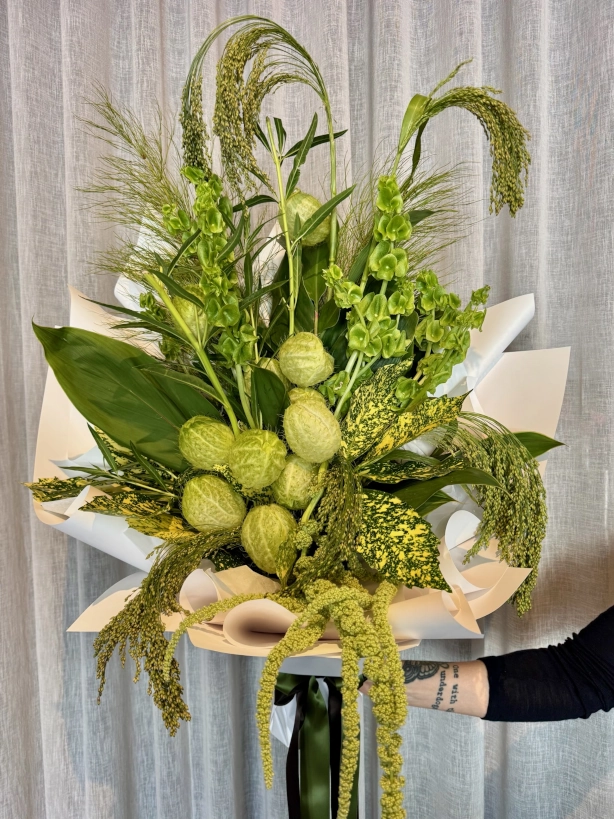 Lush, foliage-filled with green flowers including Amaranthus, Molucca Balm & Swan Flower.*